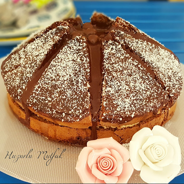 *Kekin Üst katını 8 parçaya dilimleyerek krem şantili karışım üzerine yerleştirelim *Ben üçgen dilimlere bıçak yardımı ile çikolatalı sostan sürdüm ve üzerine Hindistan cevizi serptim