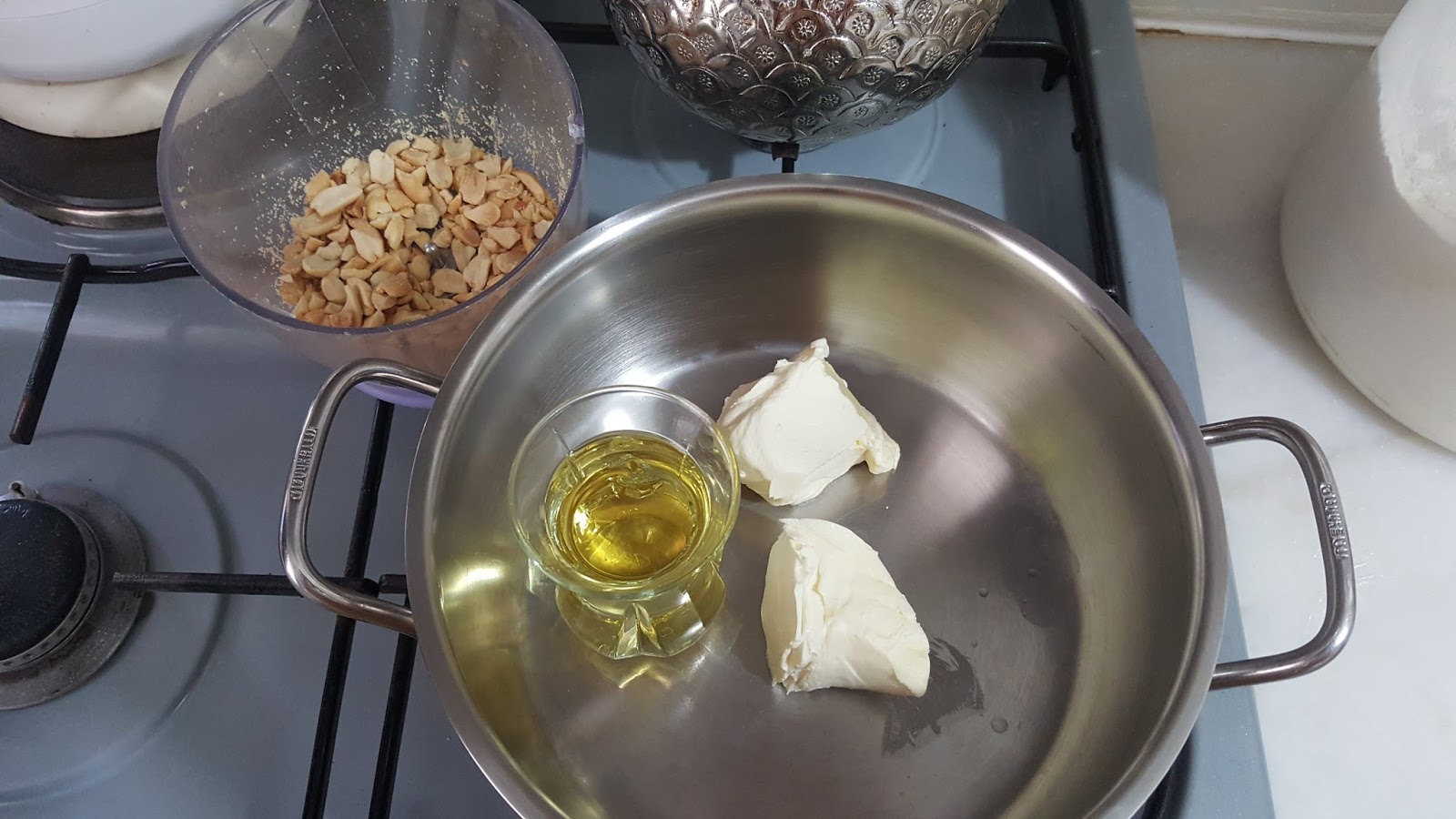 Tencereye yağları koyup erittim ve fıstıkları ekledim