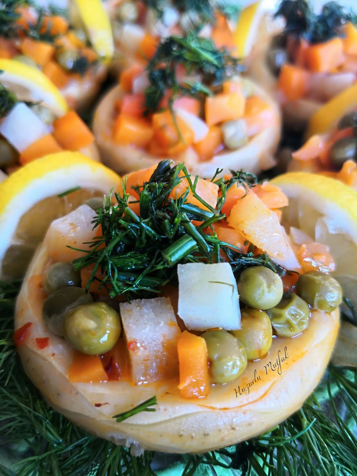 Daha sonra enginar çanaklarının Ortalarına garnitür koyun